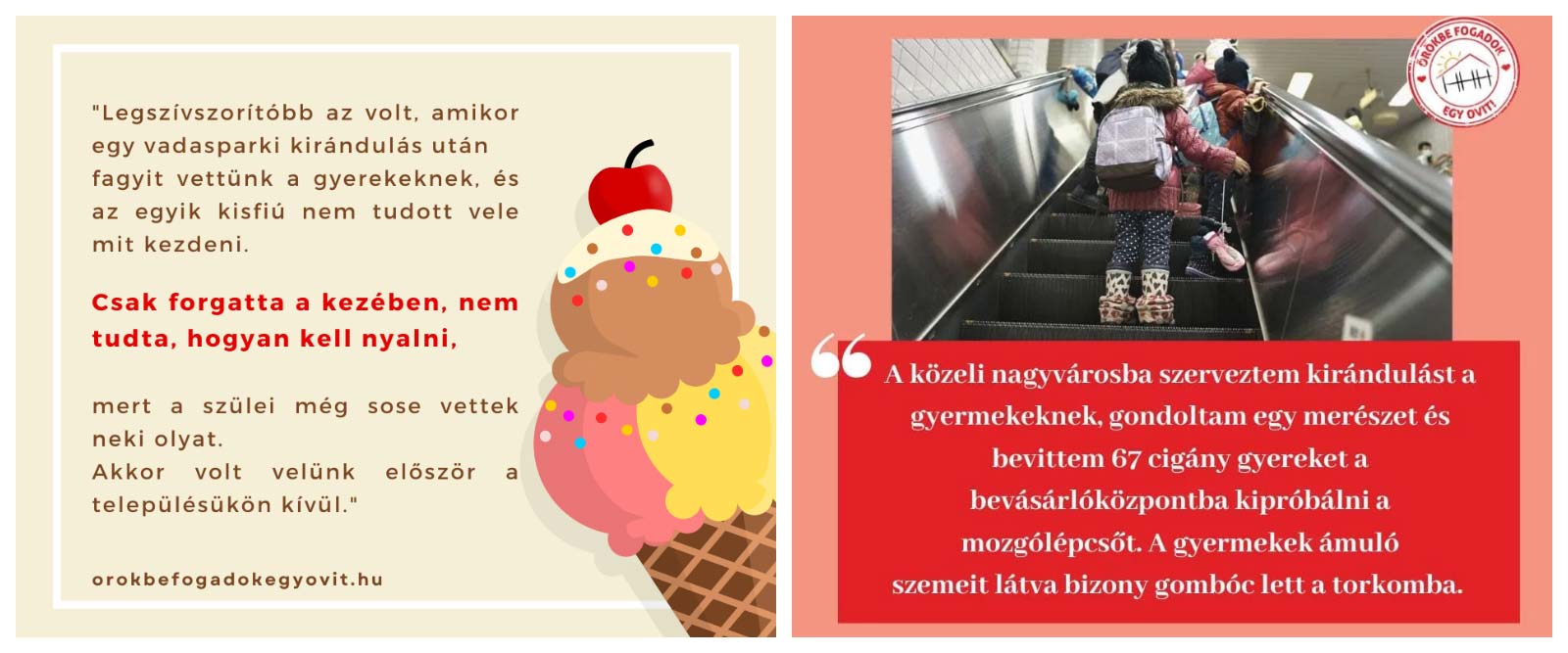 Az óvónők azt mesélik, hogy amikor sikerül megszervezniük egy kirándulást, az ovisok olyan aha-élményekkel érkeznek vissza, ami egy éven keresztül táplálja őket. Az Örökbe fogadok egy ovit mozgalom ezért hozta létre a kirándulásalapot, amely a rendszerükben regisztrált 450 hátrányos és halmozottan hátrányos helyzetű gyermeket nevelő óvoda több ezer ovisának adhat lehetőséget arra, hogy kitörhessen a szüleitől örökölt korlátok közül.